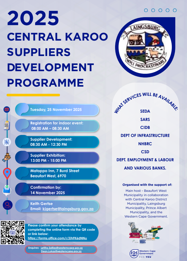 Laingsburg is a friendly, modern Karoo town, only 280 km from Cape Town. It was almost entirely destroyed by a huge flood in 1981.